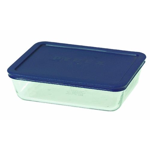 Pyrex Storage Plus Dish - Clear rectangular dish with navy blue plastic cover. - Capacity: 6 C, Material: Pyrex with Plastic Lid, Container Color: Clear, Lid Color: Navy Blue