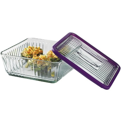 Whip up and store a delicious dish with the Anchor Hocking Bake 'N' Store covered glass baking dish. This dish is constructed from thick-walled glass with the durability and versatility to bake in the oven, store in the freezer, and reheat foods in the microwave. The fluted exterior provides an elegant touch at the serving table, and the glass itself is naturally nonporous, BPA free, and stain- and odor-resistant. This dish also includes a purple silicone gasket sleeve for airtight storage. Made in the USA, this dish is backed by a manufacturer's five year limited warranty. Best of all, it's dishwasher safe, making cleanup just as easy as cooking, serving and storing.