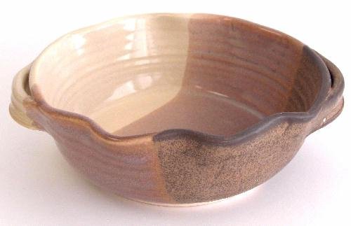 Wheel thrown stoneware brie baker. 7 inches in diameter and 2 1/2 inches tall. Handles, footed, and signed by the artist. The colour shown here is called Desert's Edge.