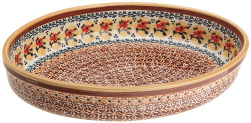 This Bunzlauer DU70 1.75-Quart Oval Baker by EuroQuest, is 12 inch long, 9 inch wide and 2 inch high. It has a lovely design in orange, red, yellow and blue. This beautiful piece represents EuroQuest's dedication to fine design, superior materials and quality construction. EuroQuest's selection of Polish pottery represents the very best of the 200-year old Bunzlauer tradition from Boleslawiec, Poland. EuroQuest deals directly with Zaklady Ceramiczne, the oldest and largest ceramics factory in the region. Each unique piece is fired at temperatures above 2,300 degrees which adds strength and creates a lasting beauty. Bunzlauer pottery is lead-free and safe for use in the oven, microwave, refrigerator and dishwasher. Each unique piece is carefully hand painted and back stamped with the company's logo, country of origin and the initials of the highly skilled artisans who performed the design work.