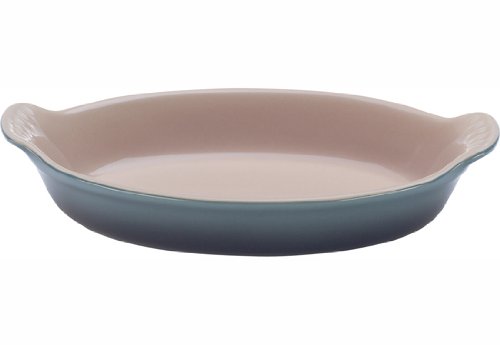 Le Creuset Bakeware: Le Creuset Heritage Stoneware 1-Quart Oval Au Gratin Dish, Fennel From indulgent desserts and hearty casseroles to freshly baked breads and more, Le Creuset's assortment of quality bakeware ensures perfect results from the oven every time. Le Creuset stoneware dishes are versatile, multi-purpose designs that offer all the even-heating benefits of stoneware in a variety of shapes and capacities to fit nearly any baking, roasting or broiling recipe. Each dish features grooved handles for a sure grip, plus Le Creuset's glazed interior that protects against utensil damage, staining and odor absorption � making each dependable piece of stoneware easy to use and easy to count on. High-quality exterior enamel protects against metal marks and other damageHard-wearing, impermeable finish fired at temperatures as high as 2192 degrees F is safe for cutting on with knivesUnmatched thermal resistance from -65 degrees F to 500 degrees F � safe for the freezer, microwave, oven, broiler and dishwasherLess than 1% porosity, blocking moisture absorption which can lead to cracking, crazing and rippling along the interiorUnique clay mixture that creates a very dense material when fired, maintaining even temperatures and preventing scorchingResistant to staining and flavor/odor absorptionA perfectly color-matched palette of bold, consistent tones for easy mixing and matching with other Le Creuset products Introduction All items in the Le Creuset stoneware range are original designs and have been hand-crafted, making each piece unique. Due to this uniqueness, there may be slight variations from piece to piece. Le Creuset Stoneware is safe for use in the microwave, freezer, refrigerator, dishwasher, oven and broiler. The maximum oven-safe temperature is 500 degrees F / 260 degrees C. The enameled surface is easy to clean and scratch-resistant. The enamel is completely hygienic and will not absorb odors or flavors. Le Creuset Stoneware is extremely strong and durable, and resists staining, chipping and cracking. The handles, knobs and rims have been designed for a secure, easy-to-hold grip. Cleaning and Care DO NOT use any Stoneware piece on the stovetop or any other direct heat source. OVEN: Maximum oven-safe temperature is 500 degrees F / 260 degrees C. Use oven mitts for lifting at all times. BROILER: When using under a broiler allow a gap of no less than 2-1/2 inches between the rim of the dish and the heat source. MICROWAVE: Handles may become hot during prolonged microwave use, especially if the handles are enclosed with plastic wrap. Cover just the open top of the dish, leaving the handles exposed. FREEZER-TO-OVEN USE: Do not place a frozen dish of food in a preheated oven. Place the frozen dish in a cold oven and set the temperature, allowing the dish and oven to heat together. Before serving always check that the center of the food is completely and uniformly hot. CLEANING: Before the first use, wash the dish in hot, soapy water, and rinse and dry thoroughly. For most day-to-day cleaning, cool the dish for a few minutes before washing and drying, or wash in the dishwasher, allowing the full cycle to complete. Never leave a dish fully immersed in water. For removal of stubborn residues allow the dish to cool, fill with warm, soapy water and allow it to soak for 10 to 20 minutes. Wash in the usual way using a plastic brush or scouring pad if necessary. Cream Catalana
