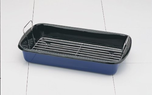 Blue enamel bakers pan with rack. Ideal for roasting, chicken, pork loin, vegetables, lasagna or baked casseroles. Glass enamel is fired at 1600 degrees to create an impermeable surface that prevents food from coming in contact with metal. Cold rolled steel ensure fast, even heat. Freezer, oven, stovetop and dishwasher safe