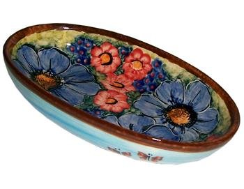 Part of ''Eva's Collection'' : 7.25'' long, 4.25'' wide and 1.5'' deep; Polish Pottery from Boleslawiec is scratch and chip resistant;lead and cadmium free; oven, microwave, dishwasher and freezer safe without losing the beautiful colors and textures. Fired at temperatures over 2,300 degrees F for long-lasting beauty.