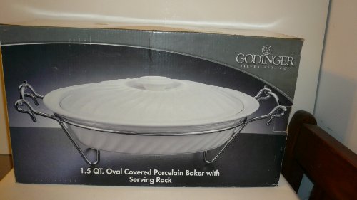 Godinger 1.5 Quart Covered Porcelain Baker with Serving Rack Description