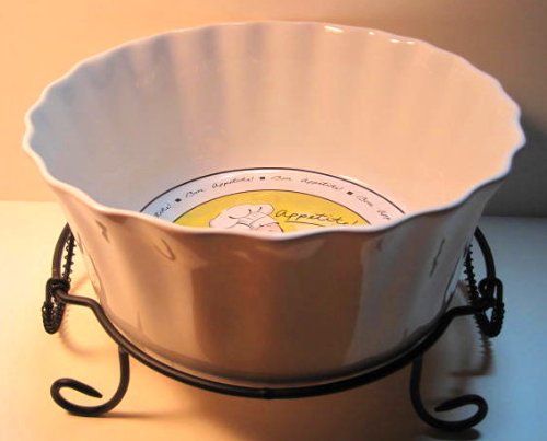 Mud Pie, Oven to Tableware, 3 1/2 Quart Casserole Server with Black Metal Rack, 'Bon Appetite' Motif Description