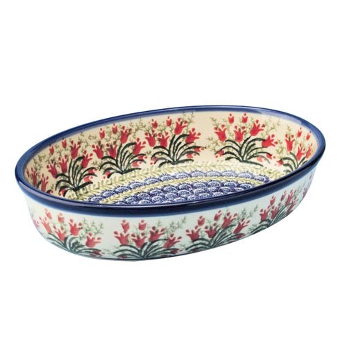 OVAL BAKER Functional Art From Boleslawiec, Poland Collection: Traditional Design By: Jolanta Okraska Size/Capacity: 9 1/2" x 6 3/8" x 2 1/4" (1qt) Shape #: 299 Pattern#: 1437 Factory: Ceramika Artystyczna (CA) This factory produces the finest stoneware of all the factories in Poland and stamps each piece with their noted seal. Factory Authentication Sticker attached. Item Description : A classic style and an ideal size for easy handling, this baker offers a variety of uses from oven to table. 100% Hand Painted, Variations To Be ExpectedPremium European Stoneware Certified Quality 1Imported Direct From Boleslawiec, Poland Dishwasher, Microwave, and Oven Safe to 450° Lead and Cadmium Free