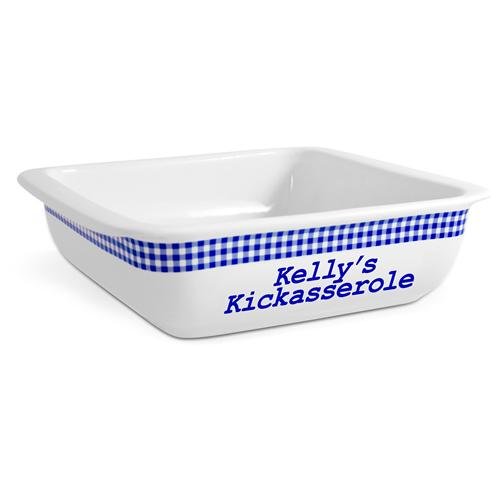 The Personalized Blue Gingham Kickasserole Dish cooks your casseroles with style! Whip up a tasty casserole in this square baking dish with 2 lines of personalization that matches the blue gingham design. This dish was made to handle fudge and its glaze allows dishes to be lifted without effort. Made in America. Personalized gifts are not returnable. Availability : The Personalized Blue Gingham Kickasserole Dish takes approximately 3 to 4 weeks to leave the warehouse. Click Here For Additional Shipping Info