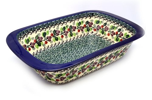 Polish Pottery Deep Dish Baker with Grip Lip - Burgundy Berry Green Features